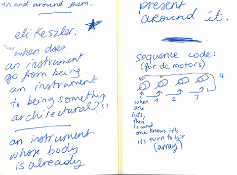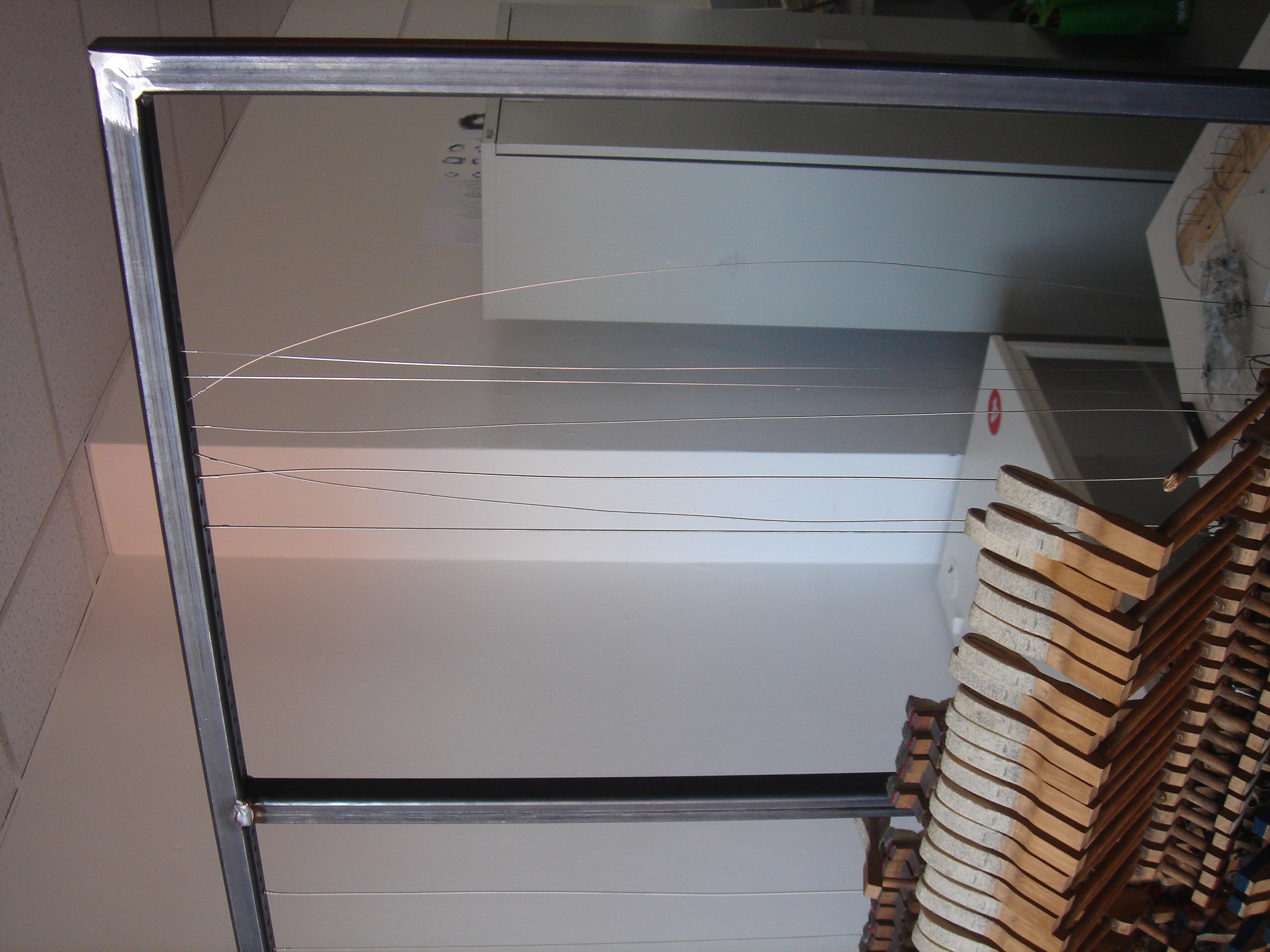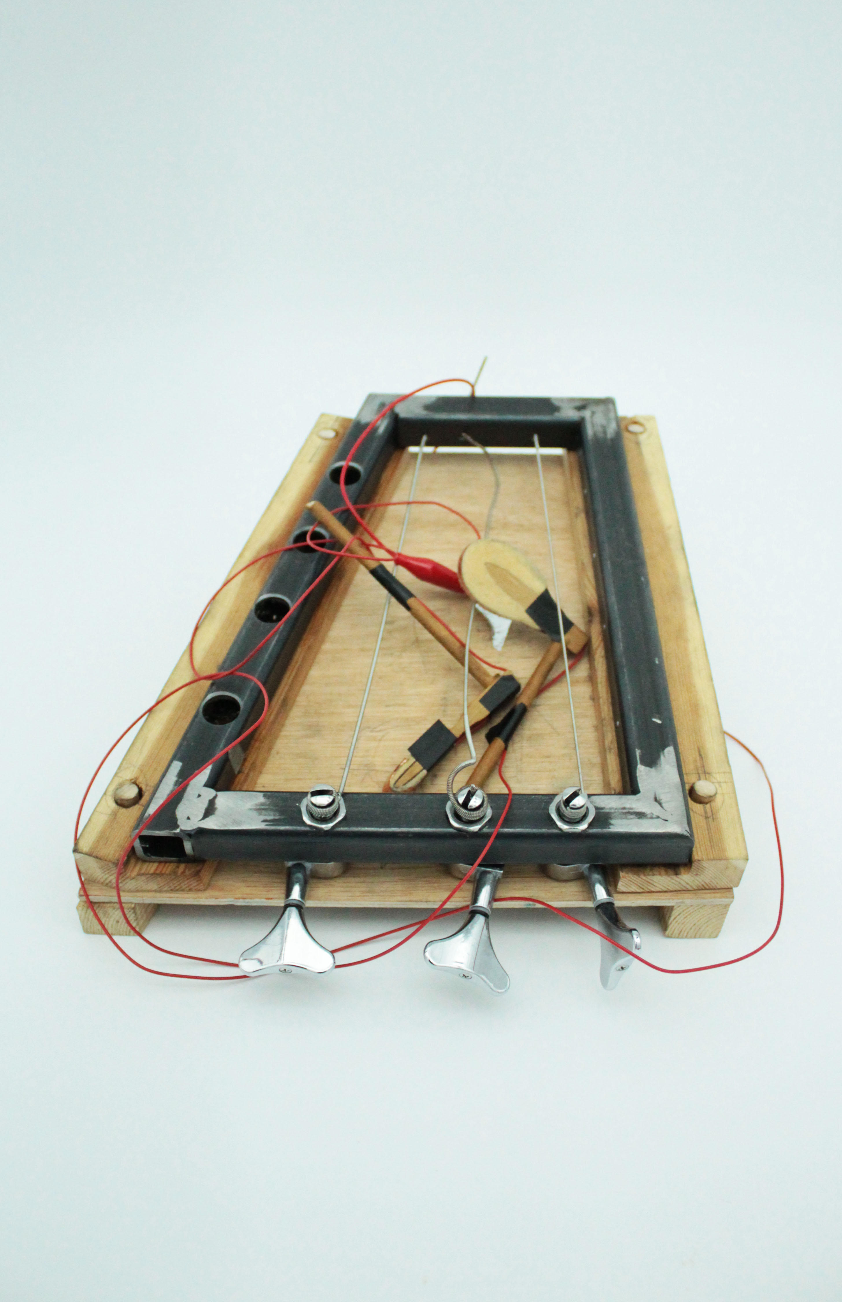 - Brillante idée que de mettre en avant le fait que ce soit un "brouillon" d'instrument. Notamment à travers la mise en lumière de la banderole qui nous fait comprendre que le processus de création est tout aussi, voire plus, important que l'objet de la création. Deux autres détails allant dans ce même sens m'ont également fait sourir/du bien: les cordes cassées et les câbles électriques connectés à rien. Encore une fois, le fait de choisir de laisser apparentes ces imperfections participe a un message global tres poetique : un dévoilement de la fragilité de cet instrument et, à travers lui, de nous même, de notre vie, de notre monde.