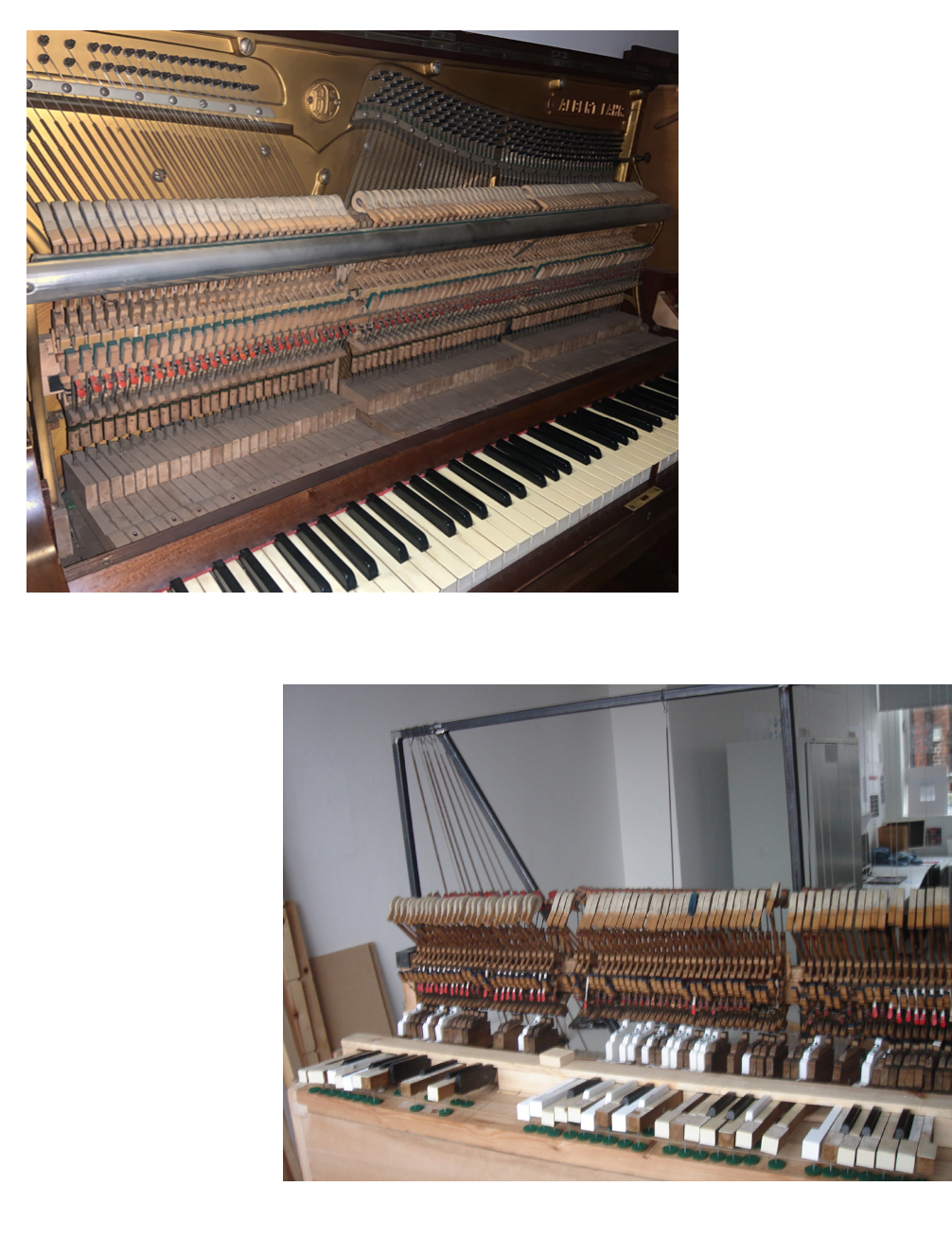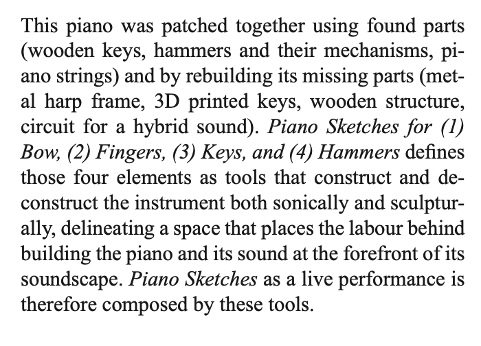 - Malheureusement je n'ai pas pu assister à la performance mais la bande son de l'installation m'a légèrement laissé sur ma faim pour être tout à fait honnête. J'aurais aimé quelque chose de plus marqué, plus fort, plus massif, plus inscrit dans cette même direction : imperfection assumée, brouillon, recherche intense, tentative d'exploration de différents aspects sonores de ce piano démembré.